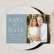 Annoncez votre date de mariage avec cette photo moderne et élégante enregistrez la carte de date. Le design comporte "Save the Date" en serif blanc et des polices de script avec un arrière - plan bleu poussiéreux. Personnalisez le minimaliste enregistrez l'annonce de la date en ajoutant vos noms, date, emplacement du mariage et photo. La carte revient à un arrière - plan bleu foncé ou à la couleur de votre choix. Le simple enregistrement de la date annonce est parfait pour n'importe quel thème mariage.