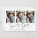 Modern manuscrit Enregistrer la date Carte photo multiple en vert émeraude et blanc dans une police qui est élégant et évoque une sensation manuscrite romantique. Conçu pour utiliser trois de vos photos préférées pour une personnalisation supplémentaire. Ajoutez facilement vos noms et dates pour un design vraiment personnalisé. Veuillez nous contacter à cedarandstring@gmail.com si vous avez besoin d'aide pour la conception ou les produits correspondants.