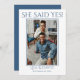 Enregistrez le Mariage photo Date conçu avec la photo de votre couple préféré. Le texte avant comprend : Elle a dit Oui!, Les prénoms de la mariée et de la mariée et la date du Mariage. Le texte inverse comprend : Enregistrer la date et Invitation formelle à suivre. Pour personnaliser, insérez simplement votre image dans notre modèle facile et cliquez sur : FIT. Soyez sûr de centrer. Le texte bleu restera en haut. Ensuite, insérez les détails de votre mariage dans le modèle étape par étape, en remplaçant l'exemple. Si vous préférez, le texte et les couleurs arrière - plans peuvent être changés à l'aide de notre outil de sélecteur de couleurs. Ce Faire-part Save The Date Photo Mariage est disponible en version imprimée et en téléchargement.