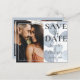 Elegante staubblaue Ankündigung Datum freihalten ist perfekt, um Ihre Hochzeitspläne in Gang zu bringen. Es verfügt über eine einzigartige Fotovorlage und große "Save the Date" Typografie mit dem Zusatz eines großen eukalyptus-Motiv, alles auf einem weißen Hintergrund. Passen Sie Ihre persönlichen Daten an.