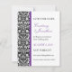 Un motif de papier peint damassé noir et blanc ainsi que des accents de pourpre royal servent à mettre en valeur cette invitation. Facilement personnalisable avec votre/vos nom(s), date et informations de l'événement. Le dos est intentionnellement laissé en blanc. Disponible en couleurs alternatives avec des faveurs, des cartes postales et des invitations assorties