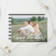 Annonce de sauvegarde de date de script fantaisiste blanc personnalisable avec un script fantaisiste et un fond rayé gris et blanc.