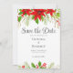 Ce classique mariage de Noël rouge et vert Save the Date présente des fleurs poinsettia vives en bas à droite de votre invitation, des baies saintes et de la verdure en haut à gauche. Une invitation botanique festive et lumineuse pour un mariage de vacances avec un script élégant.