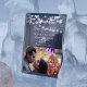 Mariage d'hiver moderne chic enregistrer la carte de date modèle avec votre photo personnalisée (fond plein horizontal / paysage orienté) sur le dos. Les flocons de neige blancs et les lumières scintillantes sur l'arrière - plan en bois de grange gris foncé font un bel aménagement hivernal sur le côté avant. Idéal pour un hiver rustique et élégant | saisonnière mariage à thème de pays des merveilles.