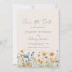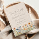 Cette décoration boho rustique présente une bordure en aquarelle de fleurs sauvages orange et bleu sur le fond. Les mots "Save the Date" et les noms du couple apparaissent dans un script design d'écriture manuscrite en gris fusain, avec le reste du texte en police sans serif sur un arrière - plan beige.