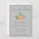 Une haute classe sauve la date, cette carte est illustrée à l'aide d'un bel arrière - plan bleu. En utilisant un jeu de couleurs bleu et marron, cette sauvegarde la date comporte un cadre marron et du texte marron. "Save the Date" est écrit en haut dans une jolie police de caractères marron. En dessous se trouve une pêche et un graphique floral bleu. En dessous, il y a des modèles pour insérer des informations mariages. Customisez vos cartes Save the Date dès aujourd'hui !