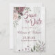 Une carte rustique "Save the Date" avec des grappes de roses peints dans les tons de rose poussiéreux sur un arrière - plan rustique en bois blanc. Vous pouvez ajouter vos informations personnelles dans l'onglet Modifier la conception. Il fait partie d'une belle suite mariage avec invitation et autres essentiels mariages.