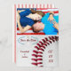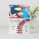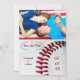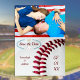 Save the Date mit einem Baseball-Thema im Hinterkopf! Obere Foto- und Text-Vorlagen, die auf diesem wunderschönen nah-up eines Baseballs bereitgestellt werden. Save the Date umgeben von goldener Krone oben, blauen grünen Lorbeeren auf jeder Seite und Baseball darunter. Baseballstich Streifen auf der Rückseite.