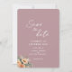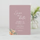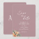 Rosa, blau, Save the Date, für Hochzeiten, mit Blume aus Aprikosen und Gartenblättern. Ein schlichtes, aber elegantes zeitgenössisches botanisches Design, inspiriert mit boho Vintagen Stil, mit Monogramm auf der Rückseite.