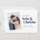 Un décontracté et moderne enregistrer la conception de la date avec une photo verticale avec une bordure d'instantané blanc, placé en diagonale avec vos détails mariages à côté en bleu marine serif moderne et écriture manuscrite.