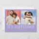 Simple and modern card featuring a text that says "It's Happening!" 2 photos on the front and one on the back. The background is lilac.