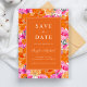 Annoncez votre grande journée avec ce jardin d'été animé rose et orange mariage enregistrer la date, disponible en tant qu'invitation de carte imprimé et un téléchargement numérique instantané. Avec ses motifs floraux d'aquarelle audacieux dans les tons rose et orange vif, il est parfait pour les couples à la recherche d'une ambiance amusante, branchée et intense. Avec son thème botanique de printemps coloré, cette unique sauvegarde la date est une façon joyeuse de donner le ton pour votre grand jour. Parfait pour un rose et orange, sauvez la fête de la date !