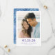 This wedding save the date features a romantic beach scene with two individuals smiling joyfully, capturing an intimate and candid moment. The design uses soft pastel colors like light blue and peach, creating a warm and inviting atmosphere. Minimalistic typography in bold purple font highlights the date and names at the bottom, set against a clean white background for balance. The overall style is realistic and affectionate, perfect for celebrating a special occasion with a cheerful and loving tone.