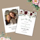 Mit dieser atemberaubenden Save the Date-Karte mit dem gleichen schönen Blumendesign in Grün, Bordeaux und Rot, wie Ihre Hochzeitssuite, verkünden Sie Ihre Hochzeitsfeier. Die Vorderseite präsentiert eine elegante Anordnung tiefbordeauxroter und weicher Rose mit zarter Vegetation und Pampas-Gras-Akzenten. Im hinteren Teil befindet sich das Foto Ihres Lieblingspärchens mit einem stilvollen, bemalten Rahmeneffekt. Dieses einheitliche Design sorgt dafür, dass Ihre Hochzeitsarbeit eine einheitliche Geschichte von der ersten Ankündigung an erzählt. Das romantische botanische Thema und die raffinierte Farbpalette schaffen den perfekten ersten Eindruck für Ihren besonderen Tag und geben den Ton für eine elegante Feier Ihrer Liebe.