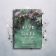 Une aquarelle fantaisie illustrant le feuillage luxuriant en vert émeraude avec des teintes de lavande et de lilas, pétillant avec des lumières féeriques et de la poussière magique, décore ce printemps quinceanera automne enregistrer l'invitation de la date avec un thème de forêt enchanté. Un élégant et moderne sauve la date d'une fête de conte de fées. Parfait pour les filles qui aiment le cadre de la forêt de contes de fées, la forêt de fées ou le thème du jardin de fées et vert émeraude avec une touche de lavande violet.