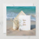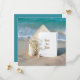 Une carte d'invitation de mariage vierge est élégamment posée sur un fond de plage, accompagnée de délicates fleurs de gypsophile blanches, d'une étoile de mer et d'un dollar de sable.