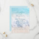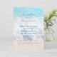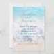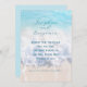 Sous-estimé, sur le thème de la mer, mariage, sauvegarder les cartes de date. Customisez avec votre libellé en trois endroits au-dessus d'une plage tropicale et d'un arrière - plan de l'océan. Des vagues arrivent à terre sur cette image. Les couleurs sont le bleu clair (l'eau en haut), la mousse de mer blanche au milieu, et le sable clair et doux au fond. Le dos de la carte est bleu clair et le texte est bleu foncé dans le script et les polices imprimées.