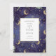 Une belle carte de mariage céleste avec une date de réservation comportant de l'or, des lunes et des étoiles ainsi que des initiales de monogramme au verso avec un fond bleu de minuit et une typographie moderne élégante. Conçue par Thisisnotme©
