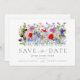 Faire-peinture aquarelle de fleurs sauvages et de feuillage pour invitation de mariage "save the date" dans des tons rose, bleu bleuet, bleu marine, violet, rose, jaune, rouge, bordeaux, magenta et vert. Personnalisez les initiales du monogramme de la mariée et du marié au dos de l'invitation. Idéal pour une invitation de mariage "save the date" unique pour un mariage de printemps ou d'été. La typographie moderne élégante en gris ardoise complète l'œuvre d'art bohème fantaisiste et magnifique qui comprend des bleuets, des pavots, des cosmos, des myosotis, des marguerites, des boutons de billy et un feuillage délicat. Invitations de mariage bohème chic "save the date" parfaites pour un mariage dans une prairie printanière ou un jardin d'été. Œuvre originale de l'artiste Catherine Sweet