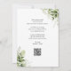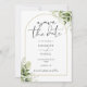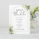 Cette élégante invitation de mariage avec feuilles de botanique et arche dorée peut être personnalisée avec vos informations dans une typographie chic avec le code QR de votre site web de mariage et les détails au verso. Conçue par Thisisnotme