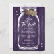 Mariage rustique violet enregistrez la carte de date avec un pot de mason et les coeurs de burlap contre un arrière - plan en bois de grange orné de lumières scintillantes. Personnalisez facilement ce mariage romantique rustique violet enregistrer la date en ligne. Objets correspondants disponibles pour compléter ce mariage violet enregistrer la carte de date.
