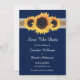 Mariage bleu marine et tournesol personnalisé enregistrer la carte de date avec tournesol contre un burlap vintage et arrière - plan dentelle orné de lampes à cordes.
