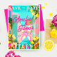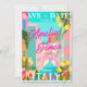 Cette illustration peinte à la main avec des couleurs vives et audacieuses présente un arrière-plan de l'Italie dans des tons rose vif, vert et bleu. Une invitation 'save the date' parfaite pour votre mariage de destination. Ajoutez votre propre photo au dos de l'invitation avec un QR code pour les détails du mariage
