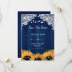 Mariage rustique bleu marine et tournesol enregistrer la carte de date avec tournesol, souffle de bébé et eucalyptus contre un arrière - plan rustique en bois.