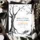 Ce design gothique simple et monochromatique est composé d'arbres esquissés, de chauves-souris et d'une toile d'araignée avec une pop de couleur orange. Le dos de la carte est un cadre blanc sur un arrière - plan noir. Les articles de mariage de coordination sont disponibles (vendus séparément). Les articles correspondants se trouvent dans notre collection "All Hallows Eve".