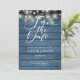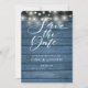 Ce rustique enregistrer la carte de date comporte des lumières à cordes et un script élégant enregistrer la date au-dessus de vos détails ensemble dans la typographie élégante sur un arrière - plan rustique de panneaux de bois bleu. Conçu par Thisisnotme©