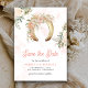 Éblouissez vos invités avec ce thème occidental enregistrer la date avec fer à cheval rustique et de belles fleurs avec typographie moderne. Ajoutez simplement les détails de votre événement sur ce modèle facile à utiliser pour en faire une carte unique de sauvegarde de la date.