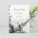 Invitation de Mariage Enregistrer la Date Bois Forêt Enchantée. Le texte est entièrement personnalisable. Présentant un cerf dans les bois par une nuit brumeuse. Fait partie de la collection Enchantée. Cette collection présente des couleurs sombres de l'automne avec du violet, bleu, gris, noir, vert et plus encore. Thème automnal sombre, rustique, gothique.