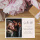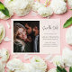Ce design comprend une carte mariage de sauvegarde à jour avec un minimaliste moderne, un script de calligraphie, un design floral brouillé, un modèle photo simple, et des détails du site Web de code QR.