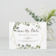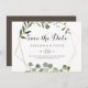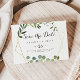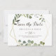 Ce mariage horizontal géométrique brun doré, sauf la date, est parfait pour un mariage moderne. Le design présente de beaux feuilles verts peints à la main dans un arrière - plan marron, ornant un cadre géométrique doré.