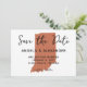 Mariage minimaliste enregistrer la date avec un script de calligraphie manuscrit moderne. Customisez la couleur terre cuite de la forme d'état de l'Illinois pour correspondre à votre palette de couleurs mariages. Le style, la couleur et la taille de la police peuvent être customisés au besoin. Sur le dos, vous pouvez changer la couleur de l'arrière - plan si vous le souhaitez.