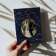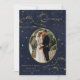 Invitation de mariage céleste mystique avec un magnifique croissant de lune doré, des étoiles et des nuages sur fond bleu de minuit, associée à des polices élégantes pour vos informations personnalisées. Cette invitation est disponible en différentes couleurs de fond, bordeaux et noir, que vous pouvez trouver dans notre magasin.
