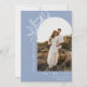 Un mariage moderne enregistrer la date faire-part avec votre photo préférée dans une arche sur un arrière - plan bleu poussiéreux avec une ligne blanche bouquet floral dessiné en blanc derrière l'arche. Ajoutez votre site web mariage QR Code à l'envers.