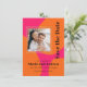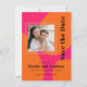Ce mariage audacieux et beau, sauf la carte de date, apparaît avec un style rétro moderne! Planifiez votre fabuleuse fête de mariage avec ce coloris de rose et d'orange chauds. Cette carte colorée a un look design avec des formes arrondies orange vif sur un arrière - plan rose chaud. Le texte modèle dans le style contemporain croquant visage avec une ambiance rétro et exécute le thème magnifiquement. Téléchargez votre photo de carré à la place de l'exemple de photo montré pour une carte personnalisée enregistrer la carte de date que vous serez fier de partager avec vos amis et votre famille.