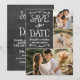 Faire part de mariage carte d'annonce de collage photo recto verso unique et fantaisiste avec une apparence de texture rustique fond tableau noir avec des polices de caractères de style écriture manuscrite qui ont l'apparence de la craie blanche. Personnalisez avec les détails du mariage et trois (3) photos de fiançailles préférées.