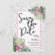 Un design tropical qui embrasse la beauté tranquille de la nature mêlée à un côté ludique qui vous aidera à vous amuser. Un mélange de feuilles tropicaux verdoyants apaisants, dont des feuilles de bananes, des palmiers, des feuilles de monstères et des plantes de princesse roses, ainsi que des fleurs apaisantes d'orchidées rose violet et des fleurs de protéa, entrelacées avec divers autres feuillages. Ajoutant un élément de plaisir, un arrière - plan noir "point de désordre" ou "point de dalmate" vient agrémenter le design d'une touche ludique. Améliorée par une police manuscrite moderne, cette impression enchanteresse rayonne de charme et de sophistication. Ce design polyvalent apporte un sens du paradis tropical à tout cadre ou occasion spéciale, le rendant parfait pour un mariage de destination, ou juste quand vous voulez ajouter une flamme tropicale. Colorful Floral Palm Watercolor Mariage tropical Enregistrer la date Disponible en tant qu'invitation imprimée, ou en tant qu'invitation numérique téléchargeable que vous pouvez envoyer par e-mail ou avoir imprimé localement !