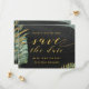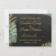 Une élégante faire-part de mariage tropicale aquarelle peinte avec un fond de lavage d'aquarelle noire spectaculaire avec des feuilles de palmiers verts magnifiquement peints et des accents dorés chatoyants. Une calligraphie de script swash en or vif annonce vos détails mariages.
