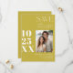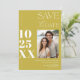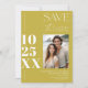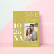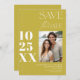 Cette carte de dattes moderne et moderne présente un design épuré et minimaliste, parfait pour les couples qui aiment une esthétique propre et sophistiquée. La carte affiche la date du mariage en caractères gras et en gros caractères sur le côté gauche, ce qui garantit que la date se démarque et se remarque facilement. Sur le côté droit, il y a un espace dédié pour une photo du couple, ajoutant une touche personnelle à la faire-part. Le texte est élégamment arrangé dans une police contemporaine, en gardant l'accent sur les détails essentiels comme les noms du couple, la date mariage et l'emplacement. L'utilisation du vert citron et blanc crée un look intemporel, faisant de cette carte un choix élégant pour tout mariage moderne.