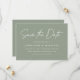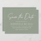Enregistrez simplement la carte de date avec "Save the Date" dans un script blanc manuscrit avec un arrière - plan vert sage. Personnalisez le moderne enregistrer la carte de date en ajoutant vos noms, date mariage, emplacement du mariage, site Web mariage, etc. Le minimaliste enregistrer la carte de date inverse pour afficher un arrière - plan vert sage solide avec de l'espace pour du texte et des photos supplémentaires.