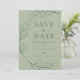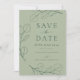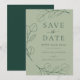 Mariage vert minimaliste feuille stylish enregistrer l'invitation de date. Beau dessin de ligne d'eucalyptus feuilles simplistes. Style de ligne verte simple design dans vert sauge et vert émeraude avec script de typographie moderne et élégant. Un design élégant et minimaliste de feuillage, facile à personnaliser à l'aide de la modèle. OEuvre originale de l'artiste Catherine Sweetman