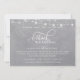 Invitations amis et famille pour rejoindre votre mariage intime "virtuel/en ligne" avec cette élégante invitation. Jolie phrase "Mariage virtuel" dans la calligraphie moderne bloc et manuscrite. Conception avec papier gris argenté faux texturé et lumières à cordes romantiques sur le dessus. Phrase en haut "Rien de fantaisiste, mais plein d'amour peut être changé à toute autre phrase que vous aimez ou même effacer. Ajoutez votre message, votre date, votre heure et votre adresse virtuelle pour que chacun puisse participer à la fête ! Retour avec le même papier texturé gris argenté, les lumières à cordes et logo élégant avec mariée et marié noms complets.