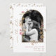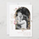 Un joli mariage sauvez le faire-part de la date avec votre photo préférée dans un cadre en arc d'or entouré de fleurs sauvages mauve et rose aquarelle et feuilles verts. "save the date" est en or de police de calligraphie moderne placé verticalement sur le côté gauche de la carte. Personnalisez avec vos détails en mauve/rose et or. Au verso se trouve un motif de fleurs sauvages.
