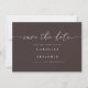 This save the date card features elegant handwritten script paired with clean modern typography on a rich mocha brown background. The minimal layout creates a timeless look that works beautifully for modern, classic, or fall weddings. The back includes a QR code so guests can easily visit your wedding website for RSVP details and event information. Personalize the names, date, and location to announce your celebration in a simple, stylish way.