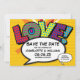Un amusant, cool et tendance rétro bande dessinée pop art inspiré enregistrer l'invitation de date qui met le wham, zap, pow dans votre faire-part de date mariage. Le verso comprend un motif de pois de BD correspondant que vous pouvez remplacer par votre propre image ou photo. Conçu par Thisisnotme©