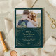 Ces cartes de save the date de mariage glamour présentent une touche moderne sur l'art déco classique. Un cadre géométrique doré champagne faux orné et des ornements décorent un fond vert émeraude élégant avec votre photo personnelle préférée pour un look de mariage dramatique et vintage.