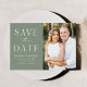 Annoncez votre date de mariage avec cette photo moderne et élégante enregistrez la carte de date. Le design comporte "Save the Date" en serif blanc et des polices de script avec un arrière - plan vert sage. Personnalisez le minimaliste enregistrez l'annonce de la date en ajoutant vos noms, date, emplacement du mariage et photo. La carte revient à un arrière - plan vert sage solide ou à la couleur de votre choix. Le simple enregistrement de la date annonce est parfait pour n'importe quel thème mariage.